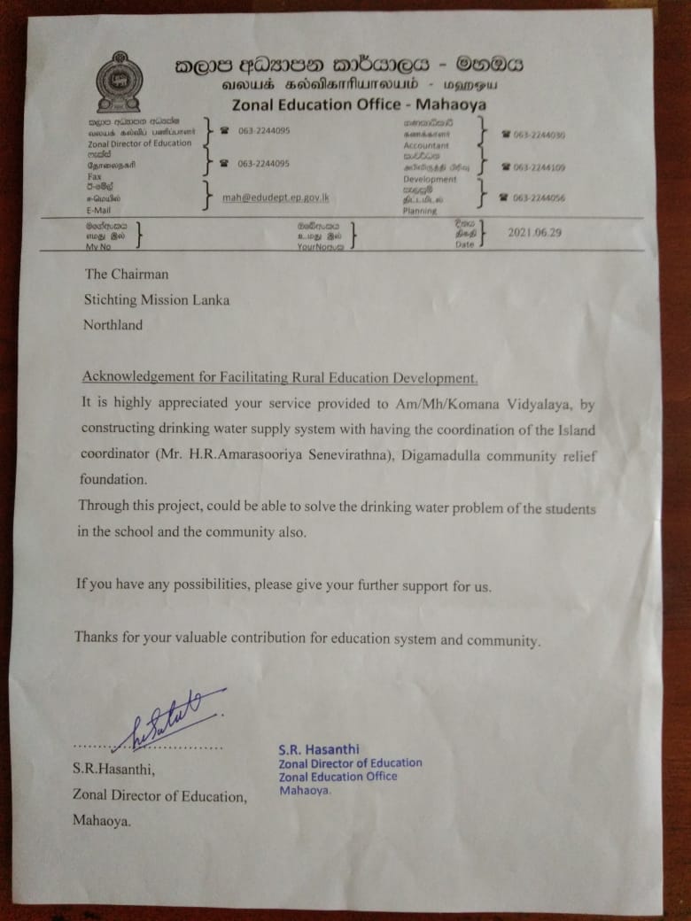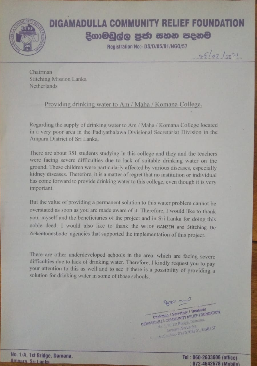 het aanpakken. De meeste scholen in de plattelandsdorpen in het Ampara-district doen dat niet hebben toegang tot drinkwater en een daarvan is Am / Maha / Komana Vidyalaya. Dit college is gevestigd in het afdelingssecretariaat van Padiyathalawa. Dit gebied is een